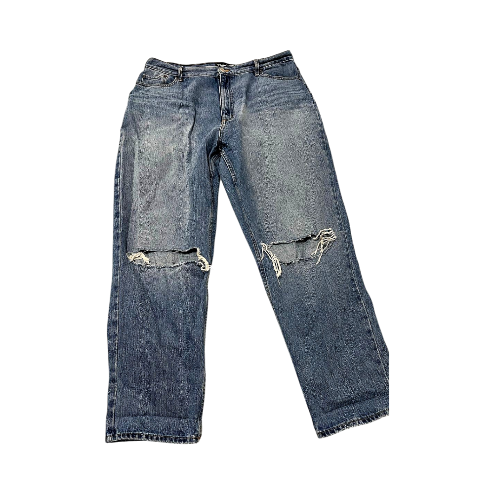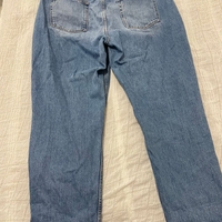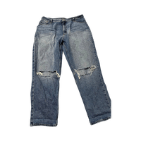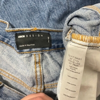 ASOS DESIGN -farkut, koko 36/30. Vaaleansiniset, korkeavyötäröiset ja malliltaan rento straight/mom. Molemmissa polvissa siistit revityt aukot. Vyötärönympärys 49 cm eikä jousta. Haaroista lahkeeseen mitta 74 cm. Materiaali 100% puuvillaa.