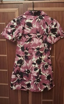 Floral print blouse with short sleeves and a button-down front. Made of cotton and elastane. Size XS.