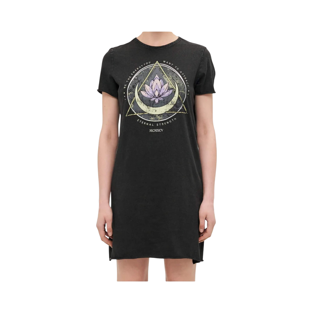 Musta t-paitamekko, kukka- ja kuvioprintti edessä.