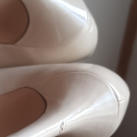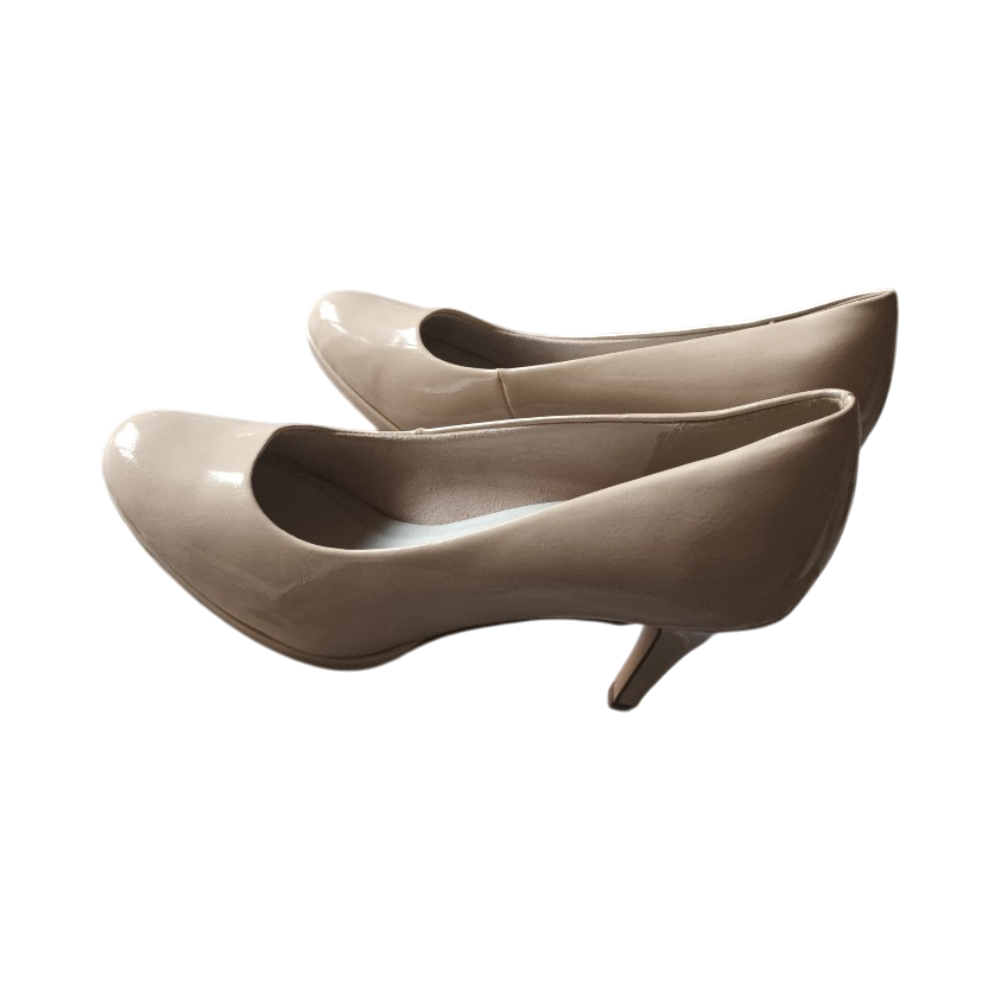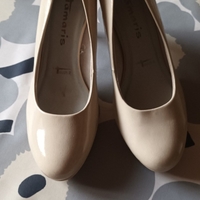 Beiget, kiiltävät avokkaat – pieni kolhu kannassa.