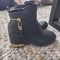 Käytetyt tekonahkaiset nilkkurit kullanvärisillä yksityiskohdilla. Hieman kuluneet, mutta ihan siistit.