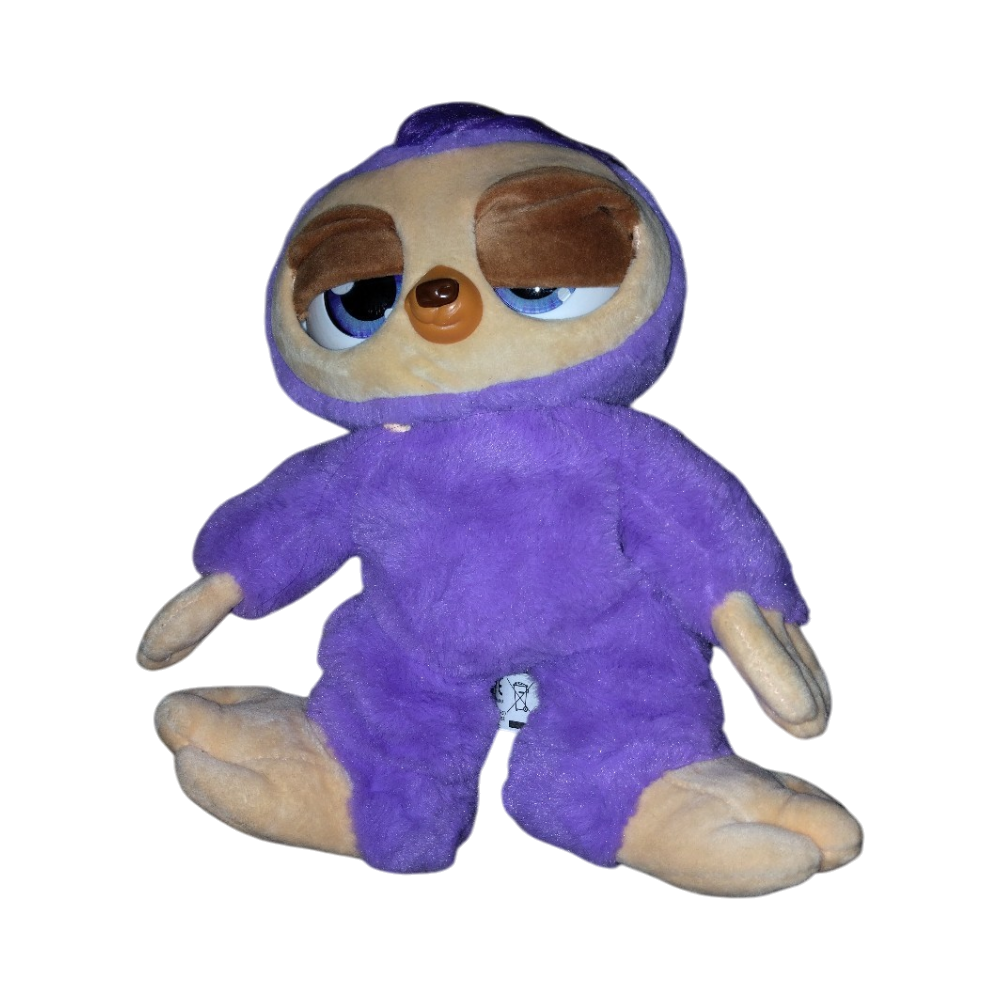 Pehmoinen violetti laiskiainen, hyvä käytetty kunto.paristotoiminen,toimii hyvin,paristot mukana..korkeus 25cm.