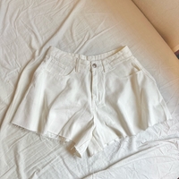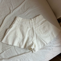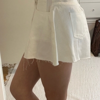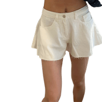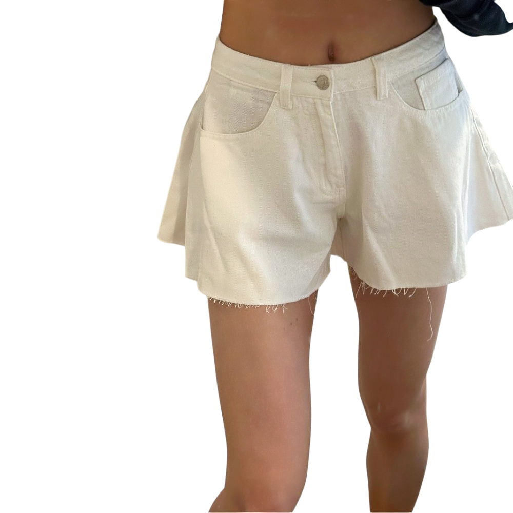 Valkoiset farkkushortsit, revityt reunat, taskut takana.
