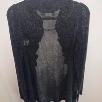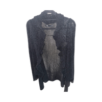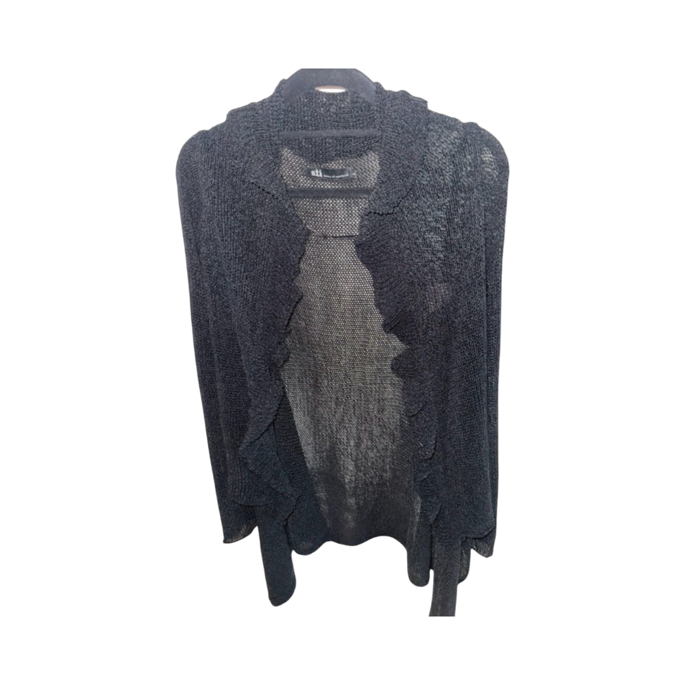Kevyt ja ilmava musta neuletakki merkiltä s.ti – luxury of comfort. Koko L. Kaunis aaltoileva reunus ja läpikuultava verkkomainen neulos tekevät tästä takista tyylikkään ja monikäyttöisen lisän arkeen ja juhlaan. Sopii hyvin kerrospukeutumiseen.