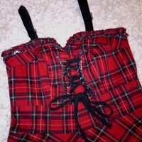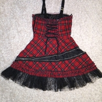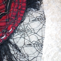 Punamusta goottimekko. Edessä ja takana korsetit. Sivussa vetoketju. Säädettävät olkaimet. Helmassa hämähäkinseitti pitsiä. Laadukas painava kangas. Merkkilappu otettu pois, mutta tietääkseni hell bunny merkkiä. Pitsistä löytyi ainakin yksi reikä (kuva). Ja sisällä helmassa pieni tahra kohta, joka ei näy käytössä (en ole yrittänyt pestä, joten voi lähteä pesussa) 🕸️