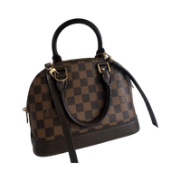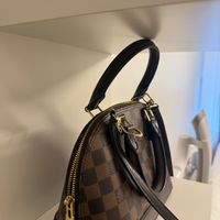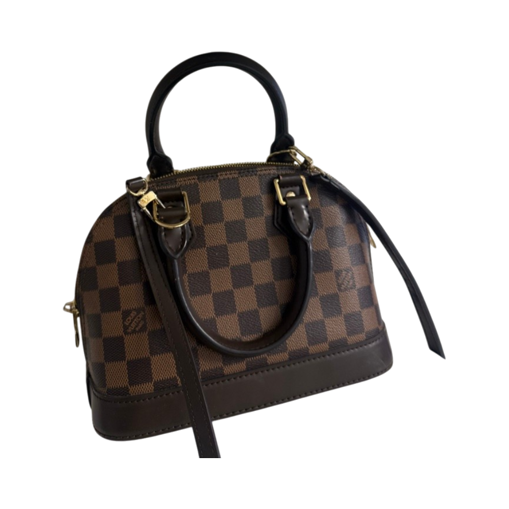 Pieni nahkareunainen olkalaukku, timanttiruudullinen kuosi.