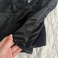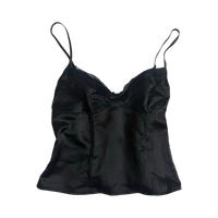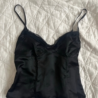 Musta satiininen hihaton toppi, pitsireunus ja säädettävät olkaimet. Sivulla piilovetoketju.