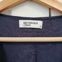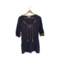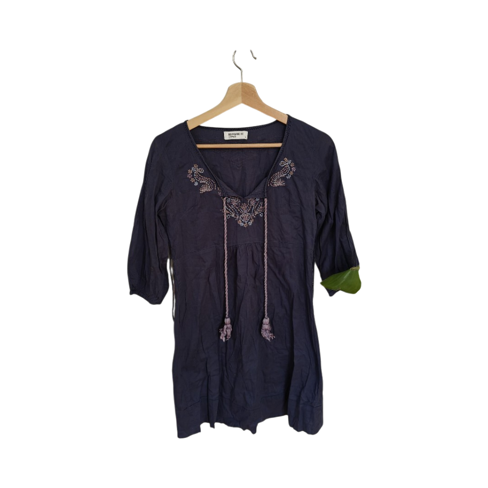 Vyötäröstä levenevä, kirjailtu v‑aukko ja nyörit, 3/4‑hihat. Tunikassa myös ohut naruvyö kiinni kiristystä varten.
