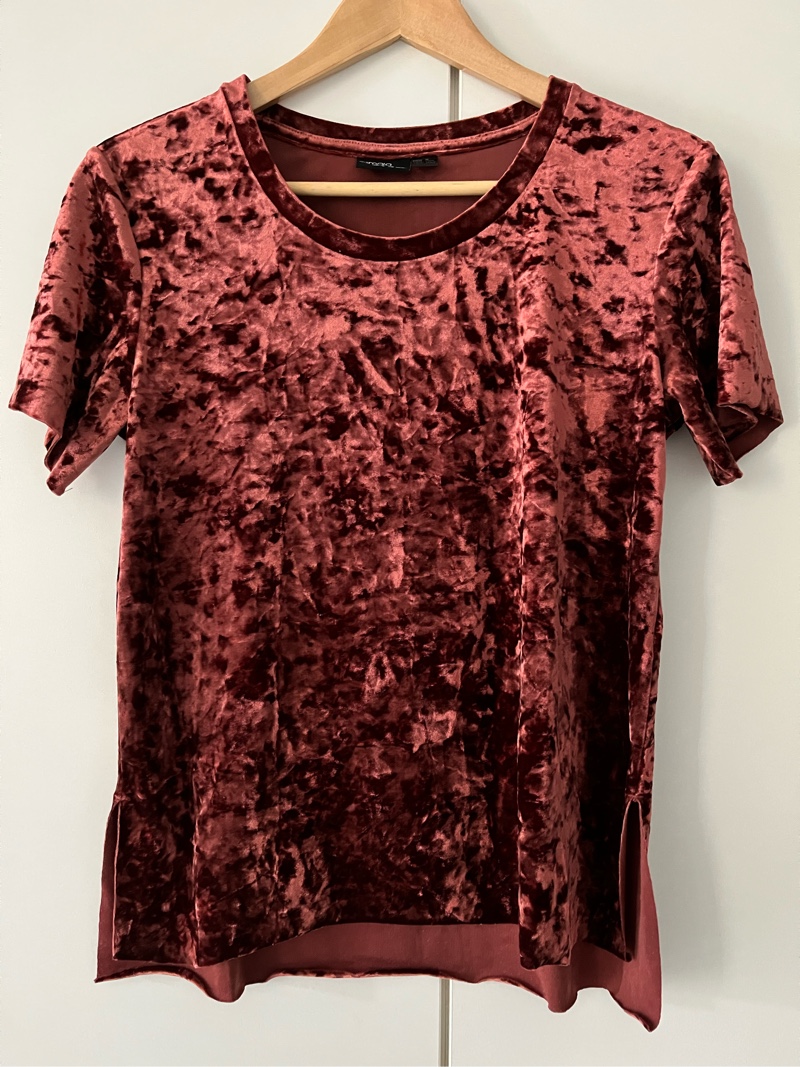 Punaruskea samettinen lyhythihainen. Halkiot sivuilla ja takaa hieman pidempi helma