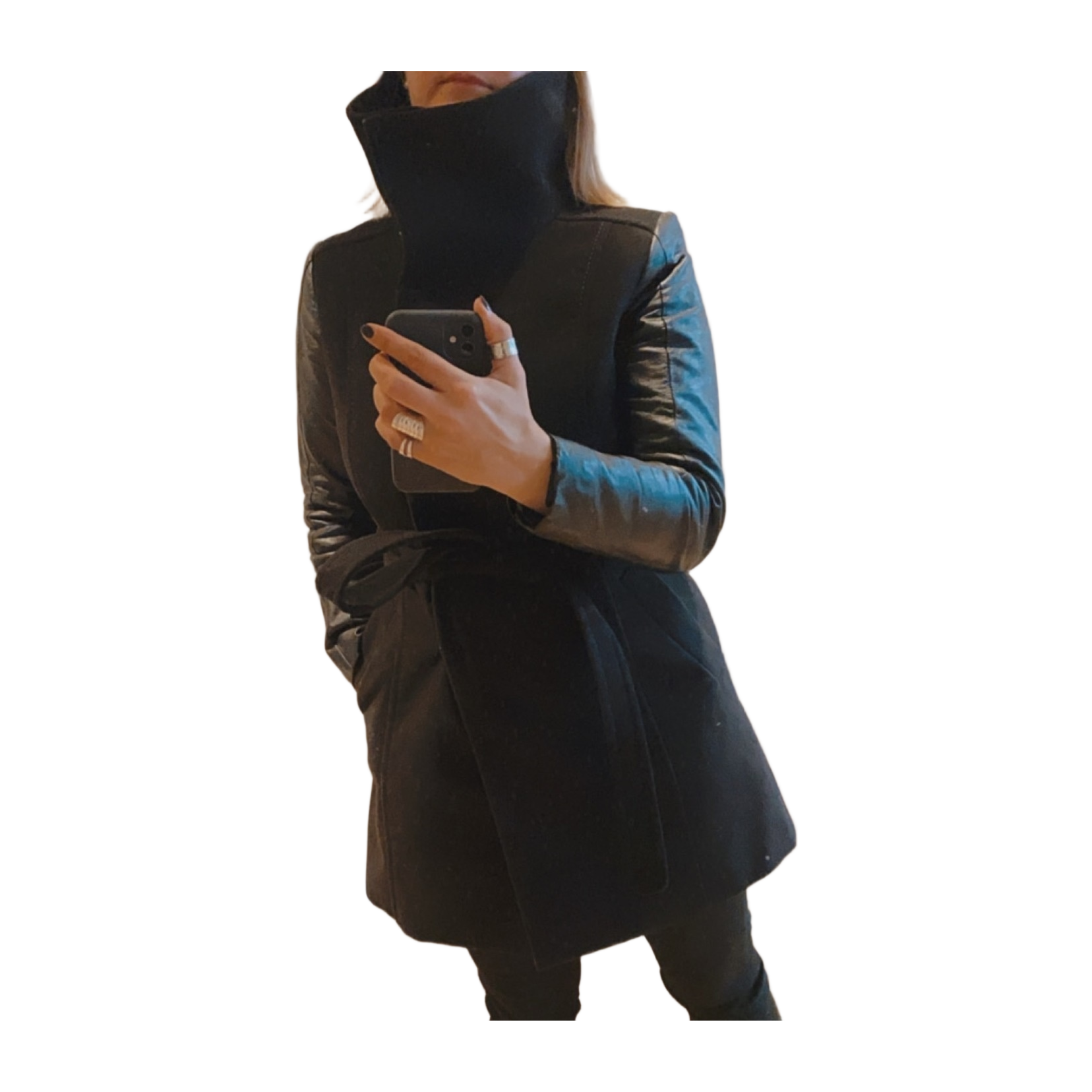 Upea nahkahihainen, tykäistuva takki! Vyötäröltä istuva malli. Korkea kaulus.