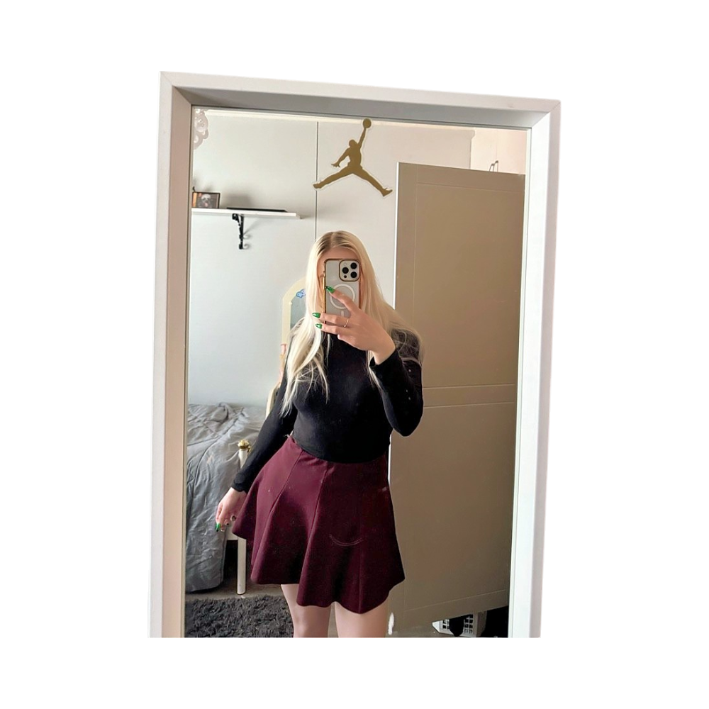 Burgundinpunainen hame, koko S, polyesteriä ja viskoosia.