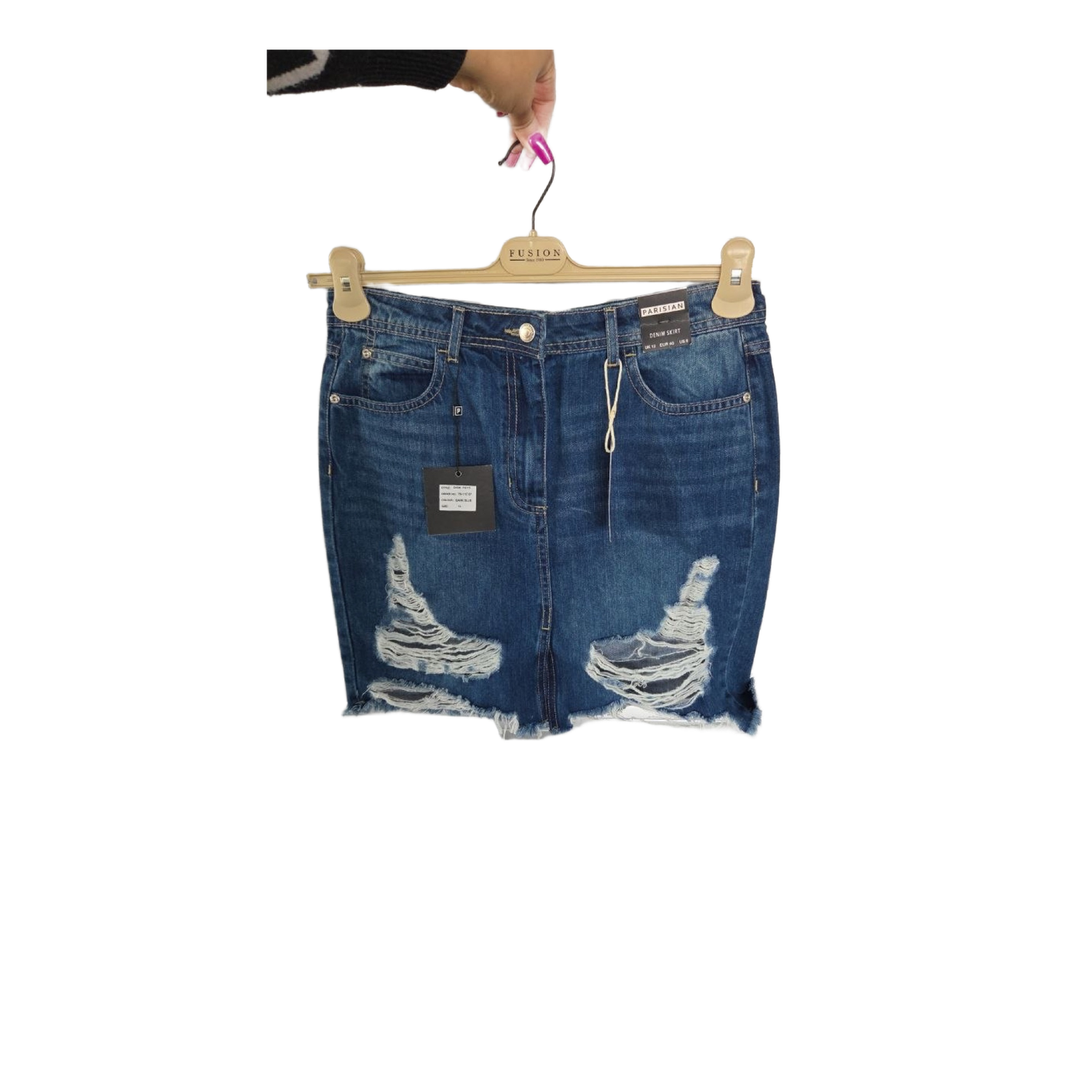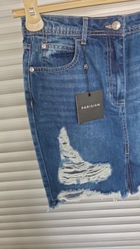 Distressed denim mini skirt with a frayed hem. Features classic pockets and button closure. Size 40.