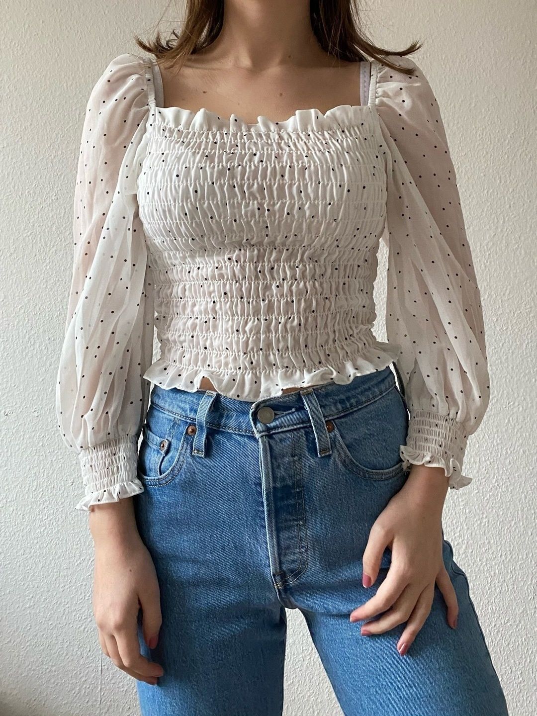 Gerafftes Blusenoberteil, kann schulterfrei getragen werden, gepunktet