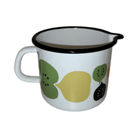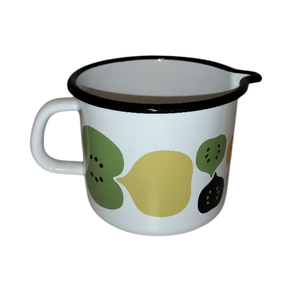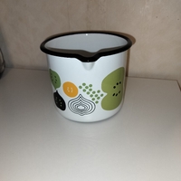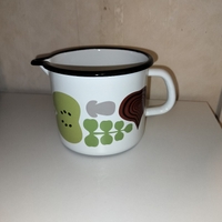 Vain pari kertaa käytetty Hackman kesäkannu. Ainut mistä löysin kulumisen jälkeä on kannun yläosassa mustan osan alapuolella, eli käytössä tätäkään ei huomaa. Vetoisuus 1,2L. Emalia.