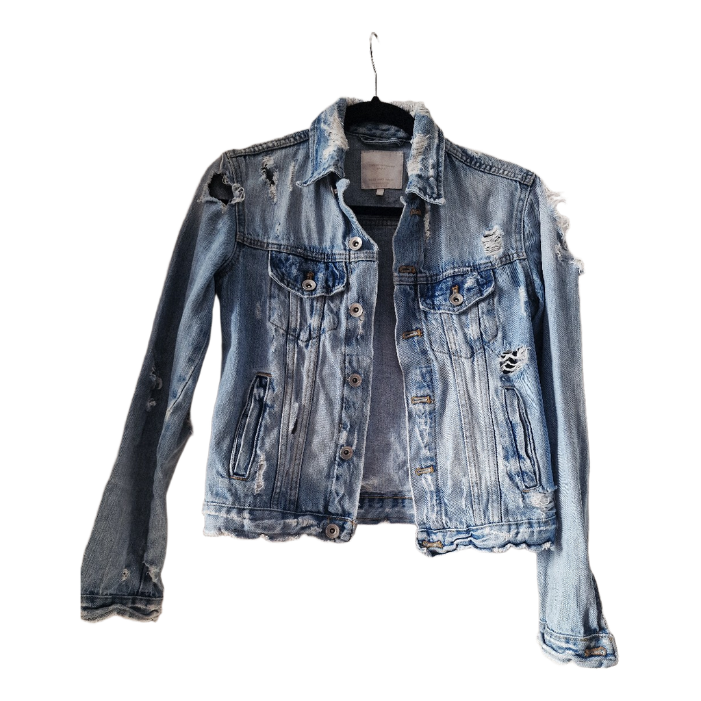 Light blue denim jacket with distressed details and frayed edges. Features button-down front, two chest pockets, and side pockets. Size XS.