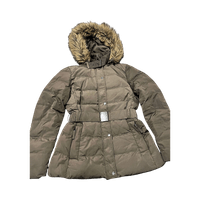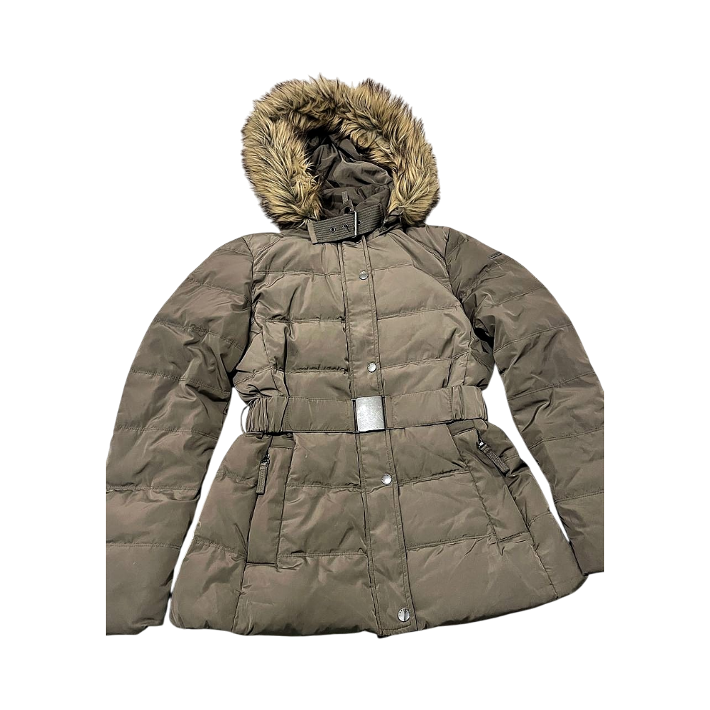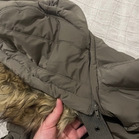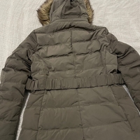 Moitteettomassa kunnossa oleva vihreä/khakin värinen Esprit untuvatakki koossa S. Takissa irroitettava huppu & hupun tekoturkis sekä vyö. Edessä 2 vetoketjutaskua. Edessä muutama pieni tahra sekä edessä oleva hopeinen nappi hieman kulunut, näistä kuva ilmoituksessa ja huomioitu hinnassa. Pintamateriaali 100% polyesteriä, täyte 70% ankan untuvaa ja 30% sulkaa. Kai-kai noin 52cm ja kai-helma 46cm.