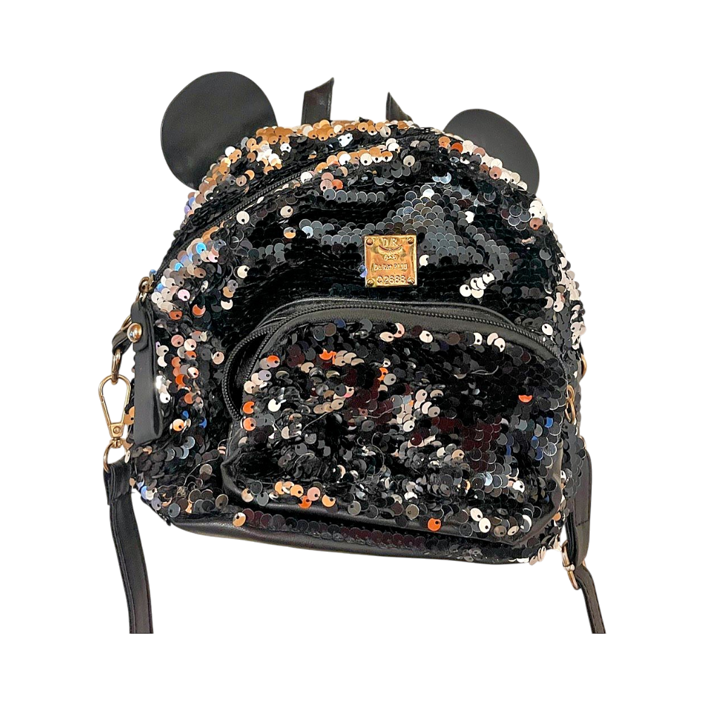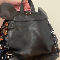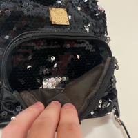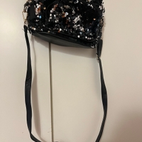 Pieni glitteri laukku korvilla. Pitkän hihnan saa irti. Edessä pikkutasku. Ison taskun sisällä pienempi tasku. Tekonahkaa, toisesta korvasta hieman alkanut kulumaan. Eläintalous MMM, lisätietoja saa kysymällä