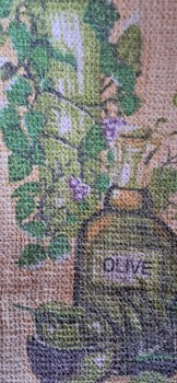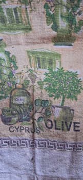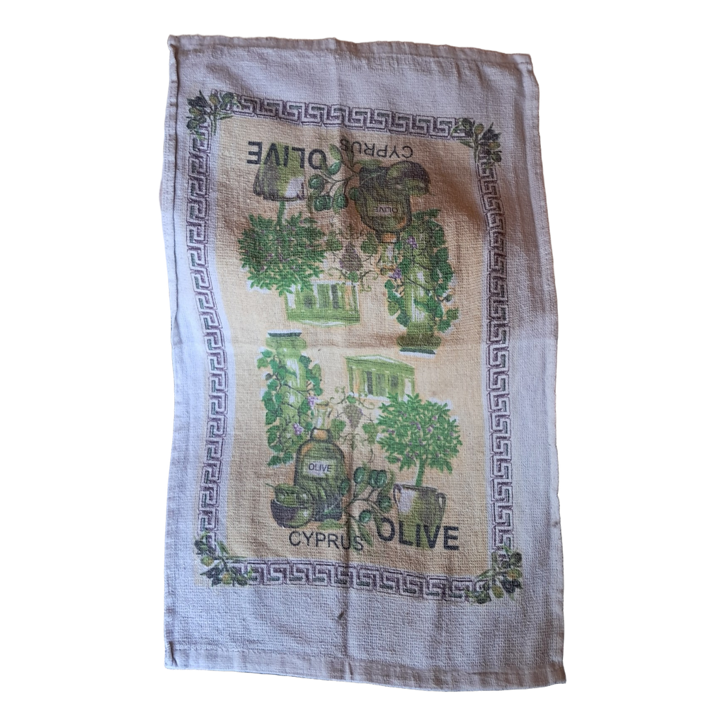 Kitchen towel featuring an olive tree and Cyprus motif. Beige background with green detailing.