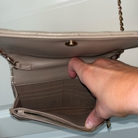 Over the shoulder clutch with removable chain strap. It is in good condition, the only signs of use are on the inside edges where jt folds and it is not noticeable when wearing the purse.