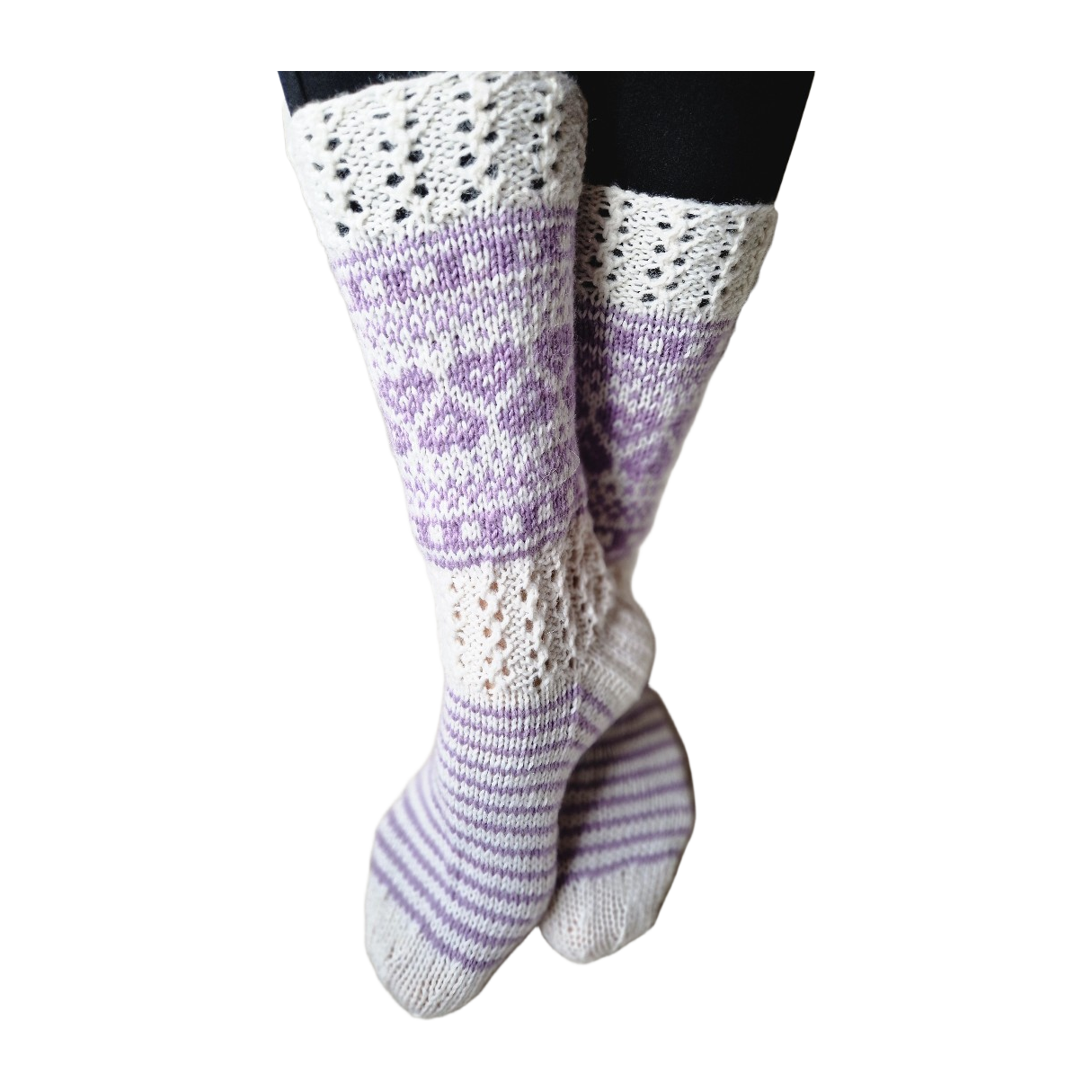 Villasukat, joissa pitsikuvio ja raidat, lämpimät ja pehmeät. Koko 38-39.