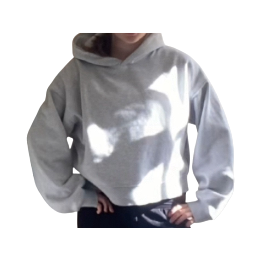 Lyhyt harmaa huppari, rento istuvuus. Takana on pienellä painettu teksti ”i can be dramatic”