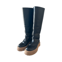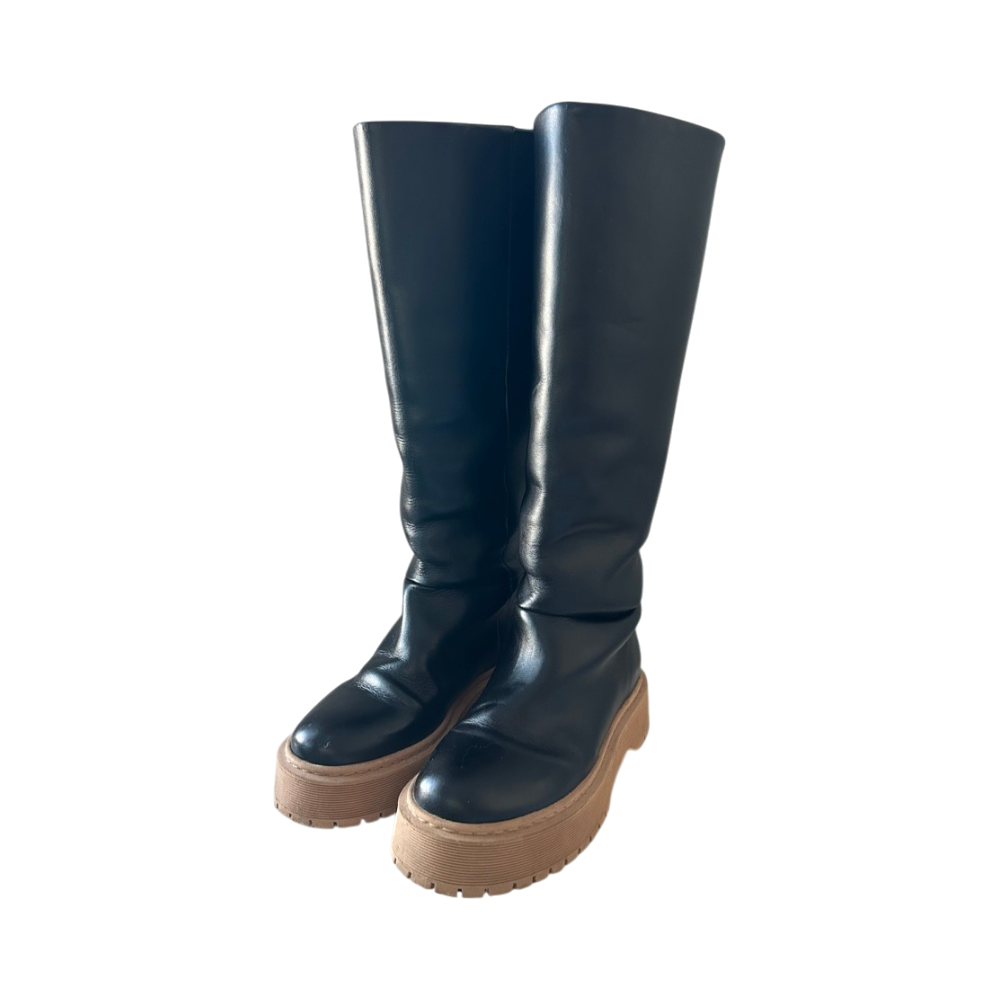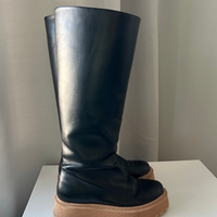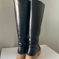 Mustat saappaat, joissa korkea pohja. Erittäin vähän käytetty, ostin kirpparilta, mutta ei sopineet minulle.