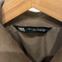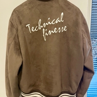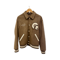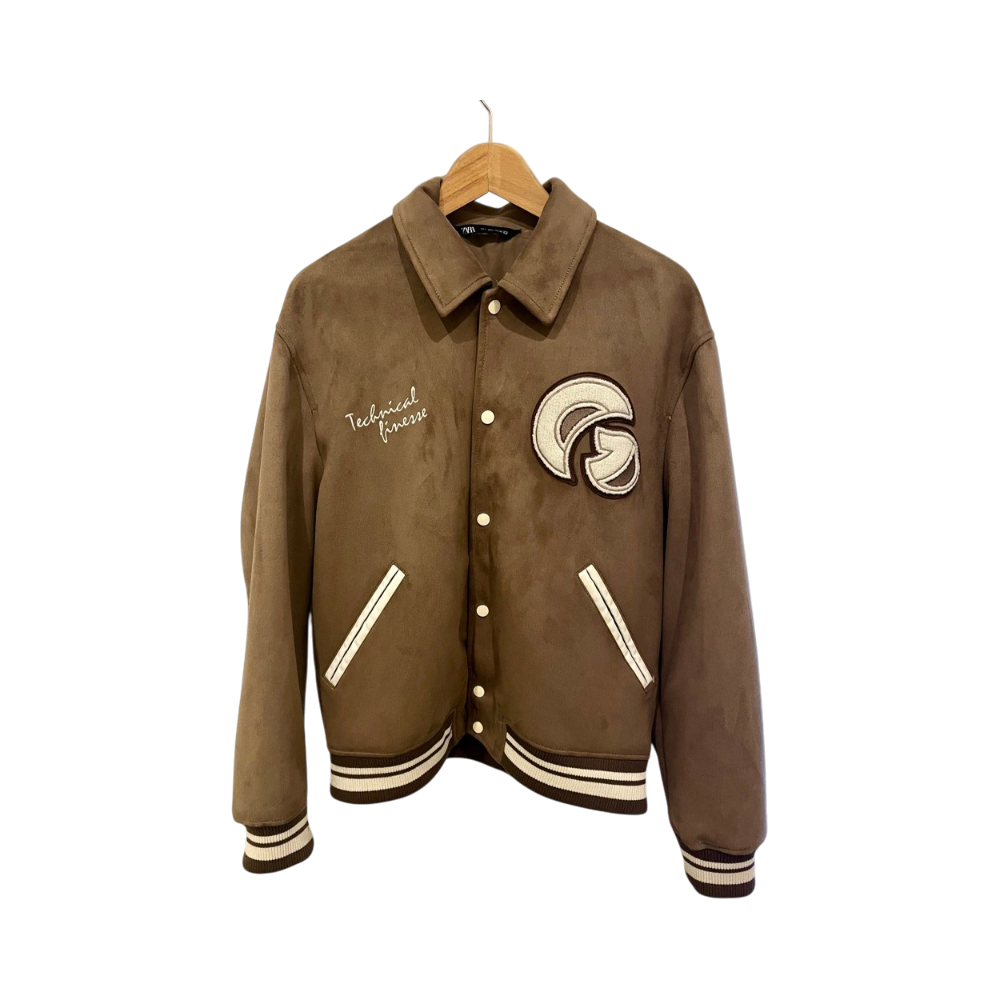 Ruskea mokkamainen varsity-takki, kirjailtu text- ja taskudetailit.