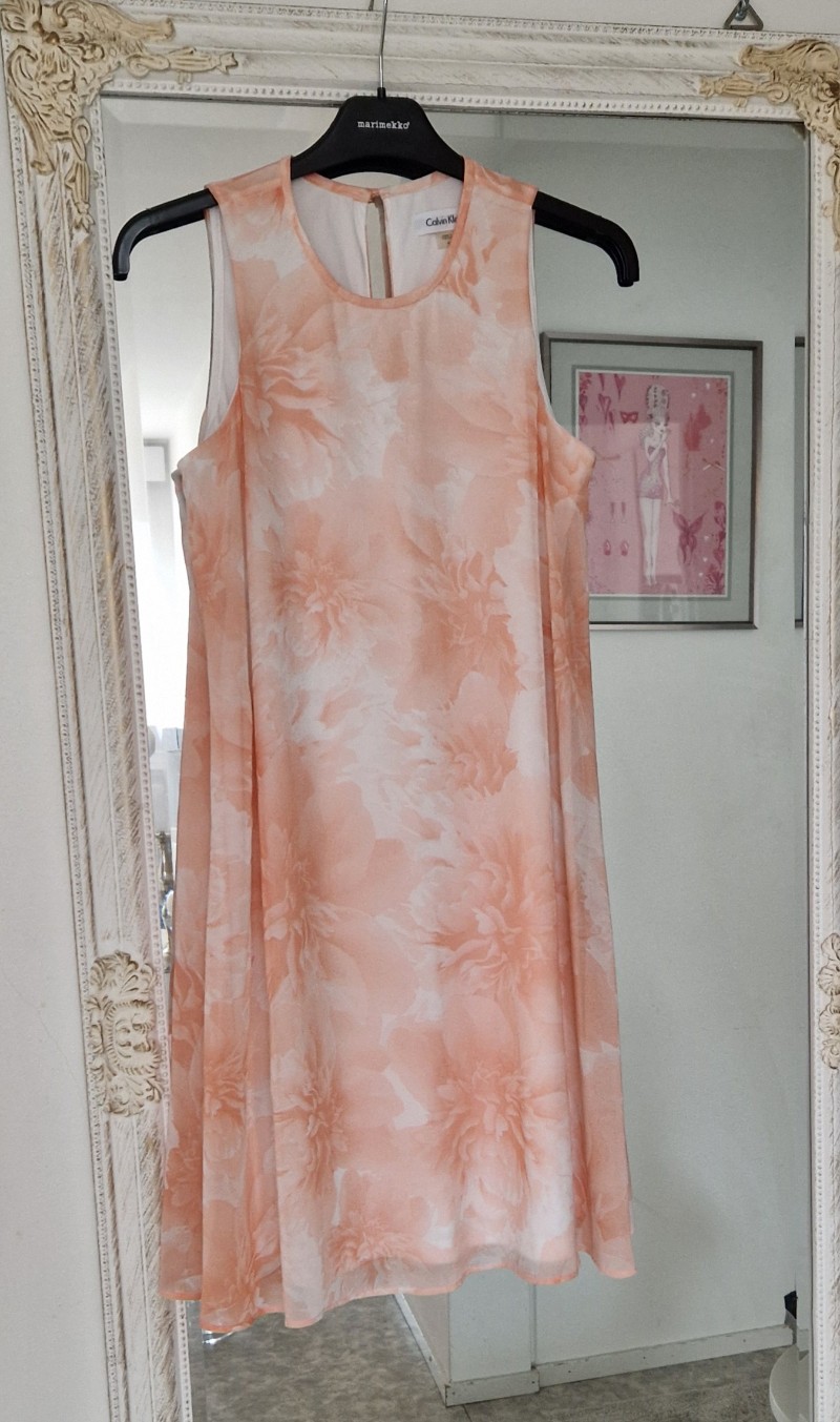 Calvin Klein hyväkuntoinen mekko, koko 4, vastaa XS. Alla valkoinen alusmekko, päällä ohut päälliskangas, valkoisen ja persikan väreissä.