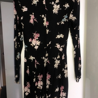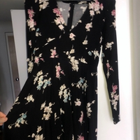 Pitkähihainen musta mekko vaaleilla kukkakuoseilla. Pitkät hihat ja takana vetoketju. Koko S. Merkki on Envii