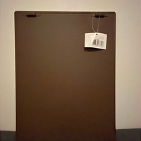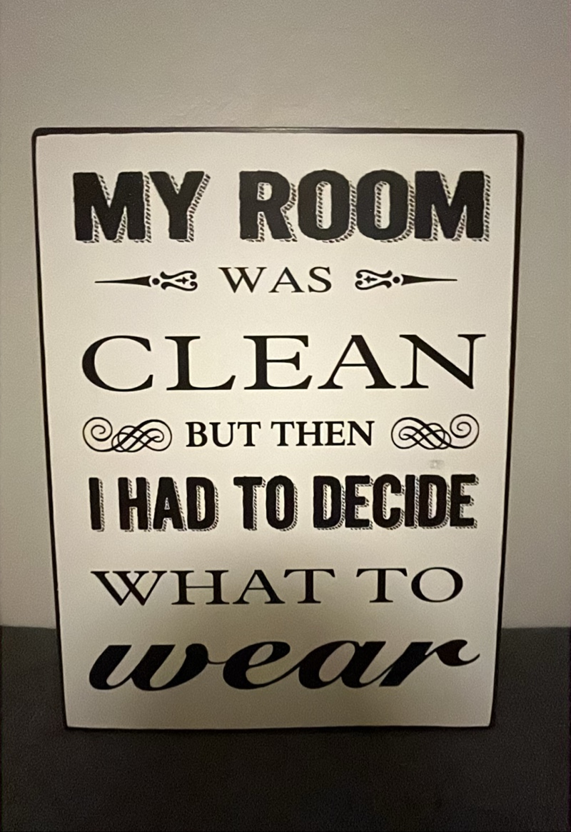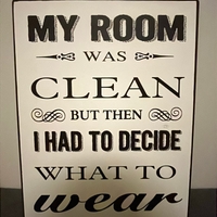 Uusi pukeutumis aiheinen peltikyltti jossa takana kaksi ripustuskohtaa, mitat noin 27x35cm