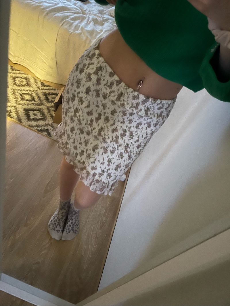 Valkoinen kukkakuvioinen hame röyhelöreunuksella.