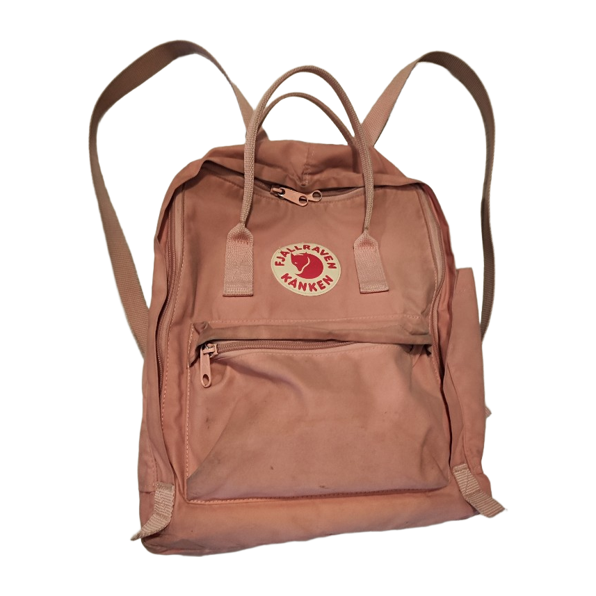 Vaaleanpunainen Fjällräven Kånken reppu, käytetty kunto. Vetoketju ei aukea kokonaan toiselta puolelta.