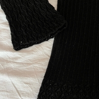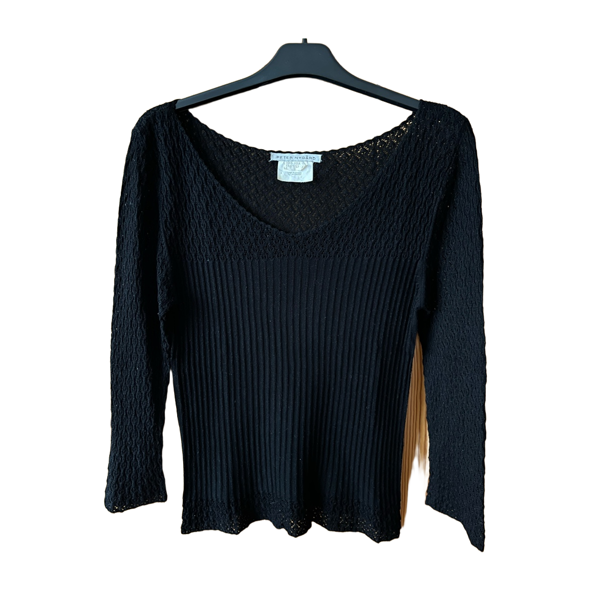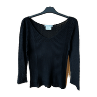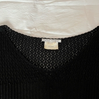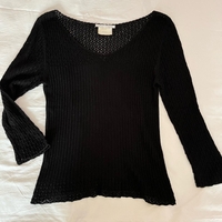 Naisten musta ohut silkkineulepusero pitsineuletta edessä ylhäällä, hihat ja helma. Miehusta joustavaa oikein/nurin neuletta. Laakea v-pääntie.