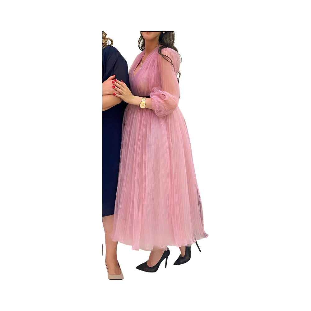 Pitkä vaaleanpunainen juhlamekko, läpikuultavat hihat