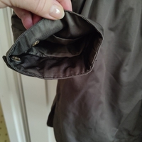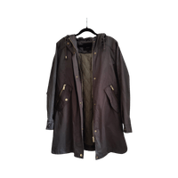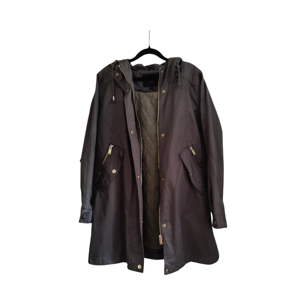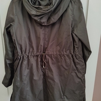 Kevyt hupullinen parka, vyötäröllä kiristysnyöri ja vetoketju. Oikea väri ei tullut kuvaan, kuvassa näkyy luumuvihreä väri vuoressa. Takkia on vähänkäytetty. Kainalo-kainalo mitta 55cm Olka-helma 82cm