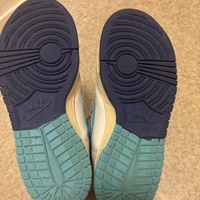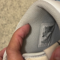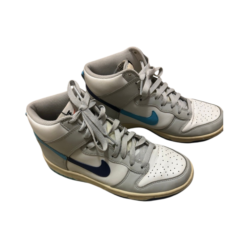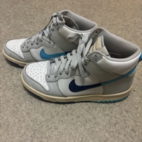 Light grey/white sneakers with blue swoosh and two-tone sole.