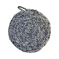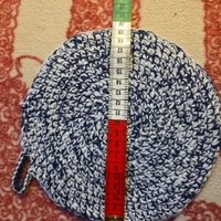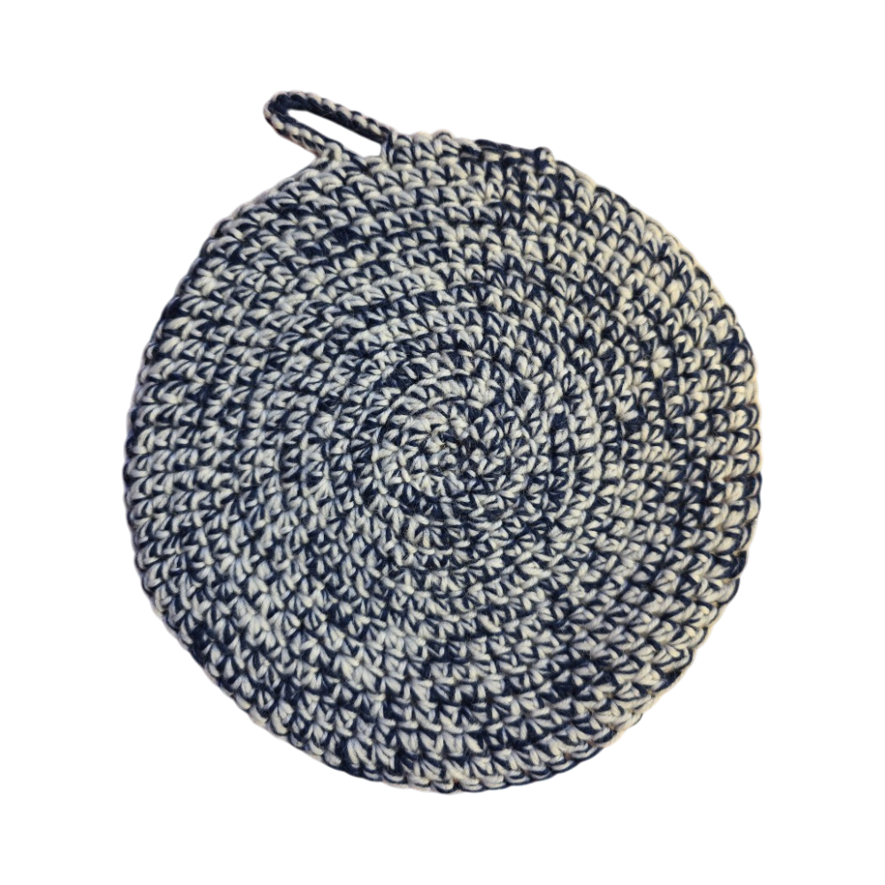 Käsityönä virkattu pyöreä pannunalunen, ripustuslenkillä.