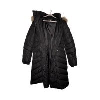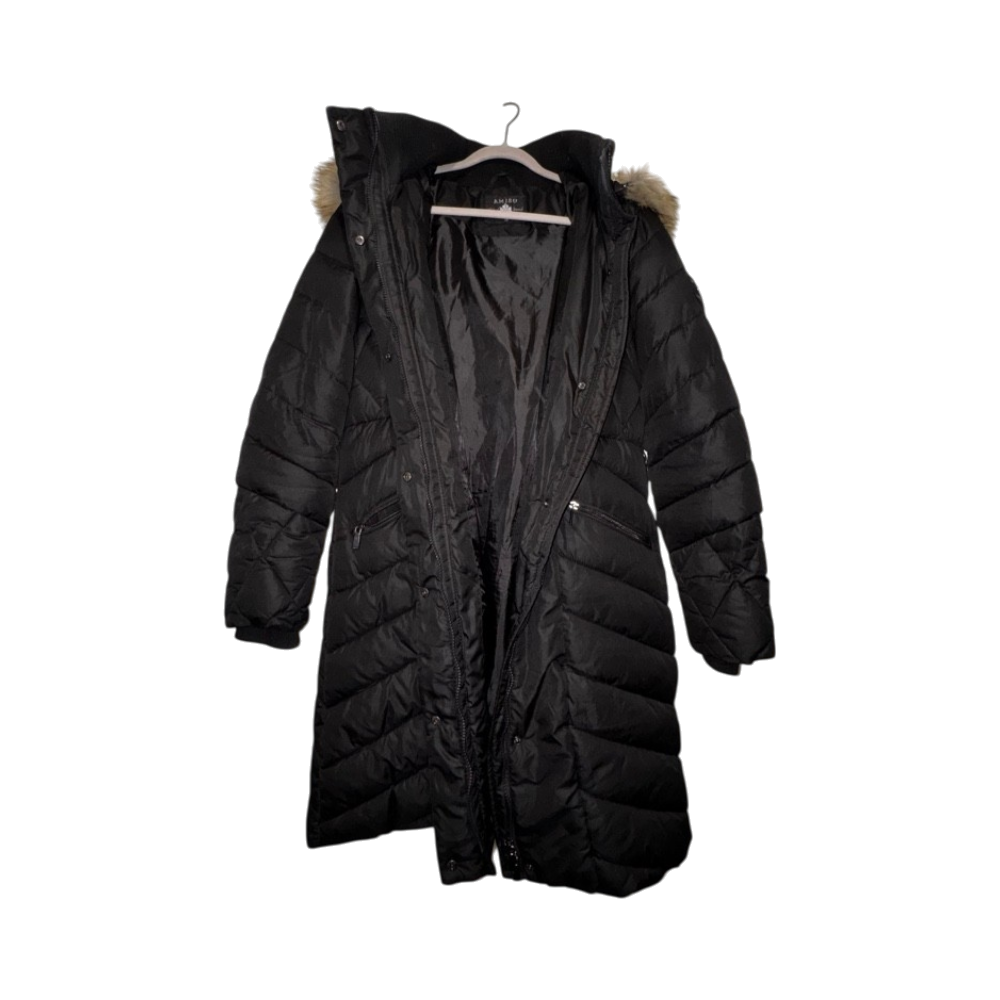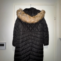 Pitkä, toppaustakki irrotettavalla huivireunuksella.