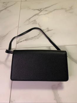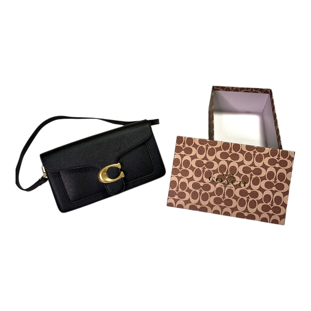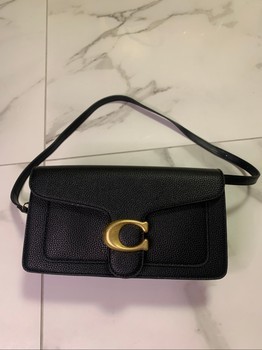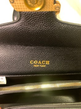 Black pebbled leather shoulder bag with gold-tone hardware. Features a prominent 'C' clasp and a top flap closure. The interior includes a zippered pocket and is embossed with 'Coach New York'.