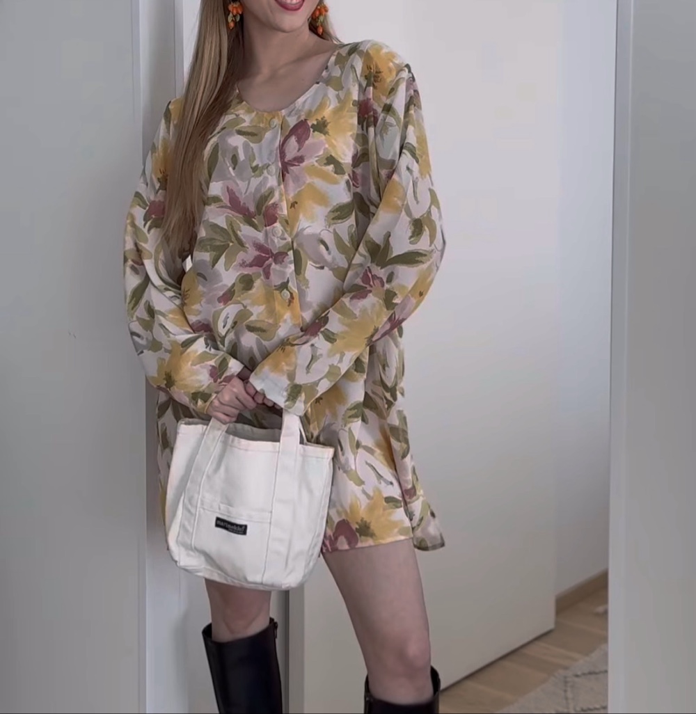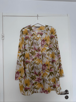 Upea Tuomi napitettava pusero jota voi käyttää myös halutessaan mekkona. Molemmilla puolilla on halkiot sekä puserosta löytyy myös olkatoppaukset, jotka voi halutessaan irroittaa leikkaamalla pari ommelta. Koko 46 mutta sopii pienemmällekin riippuen millaisen kokonaisuuden haluaa puserosta itselleen luoda!