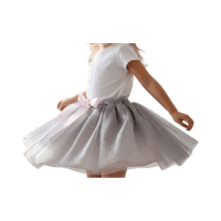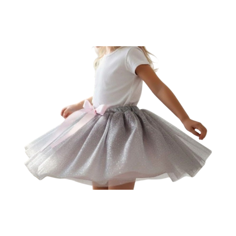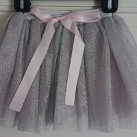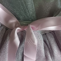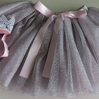 Helmenharmaa/vaaleanpunainen tyllihame satiininauhalla & hopeaglitterillä. Mukana harmaa pitsimäinen kruunu joustavalla kuminauhalla. Täysin käyttämätön. Sopii juhlamekoksi tai naamiaisasuksi/ leikkeihin.