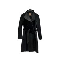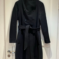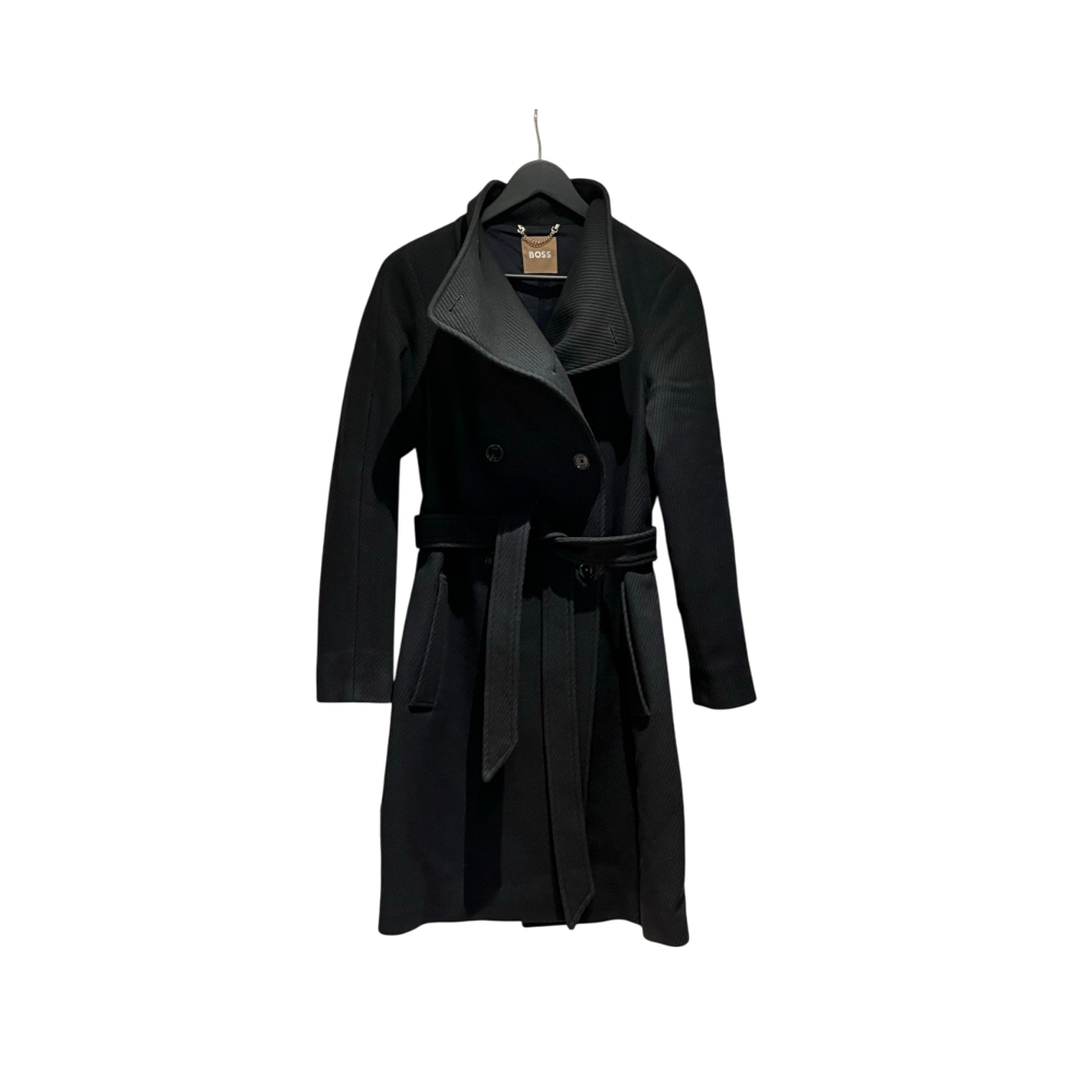 Hugo Boss polvipituinen tummansininen villakangastakki, koko 36. Takissa on kaksirivinen napitus ja irrotettava vyö, molemmin puolin taskut. Ostettu 2 vuotta sitten, ovh 399€.