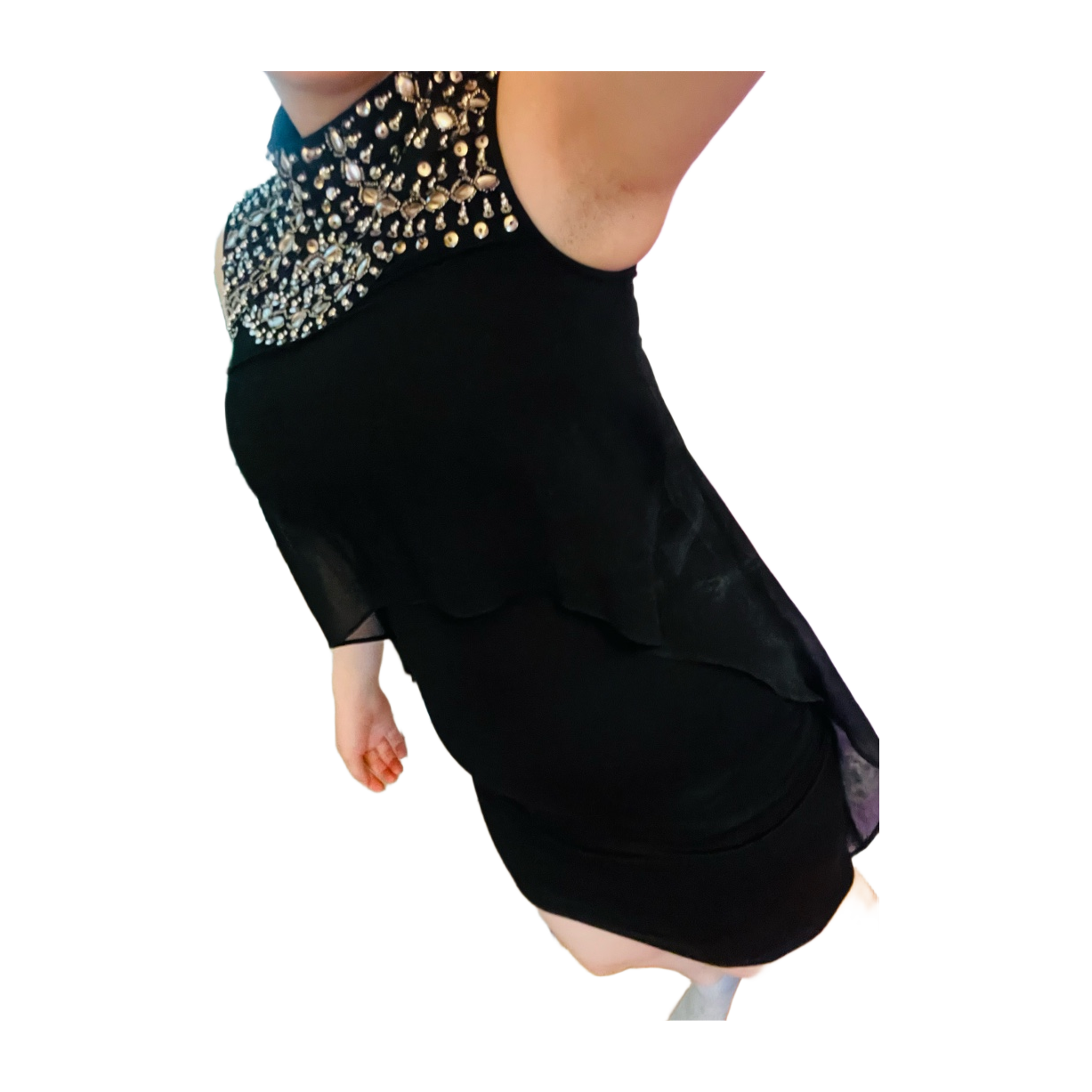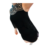 Musta mekko hopeisilla koristeilla ja läpikuultavalla kerroksella.