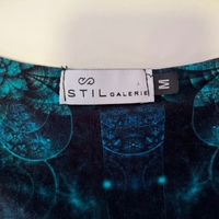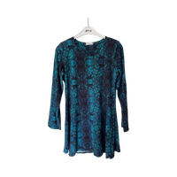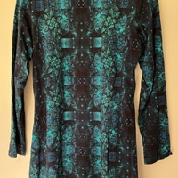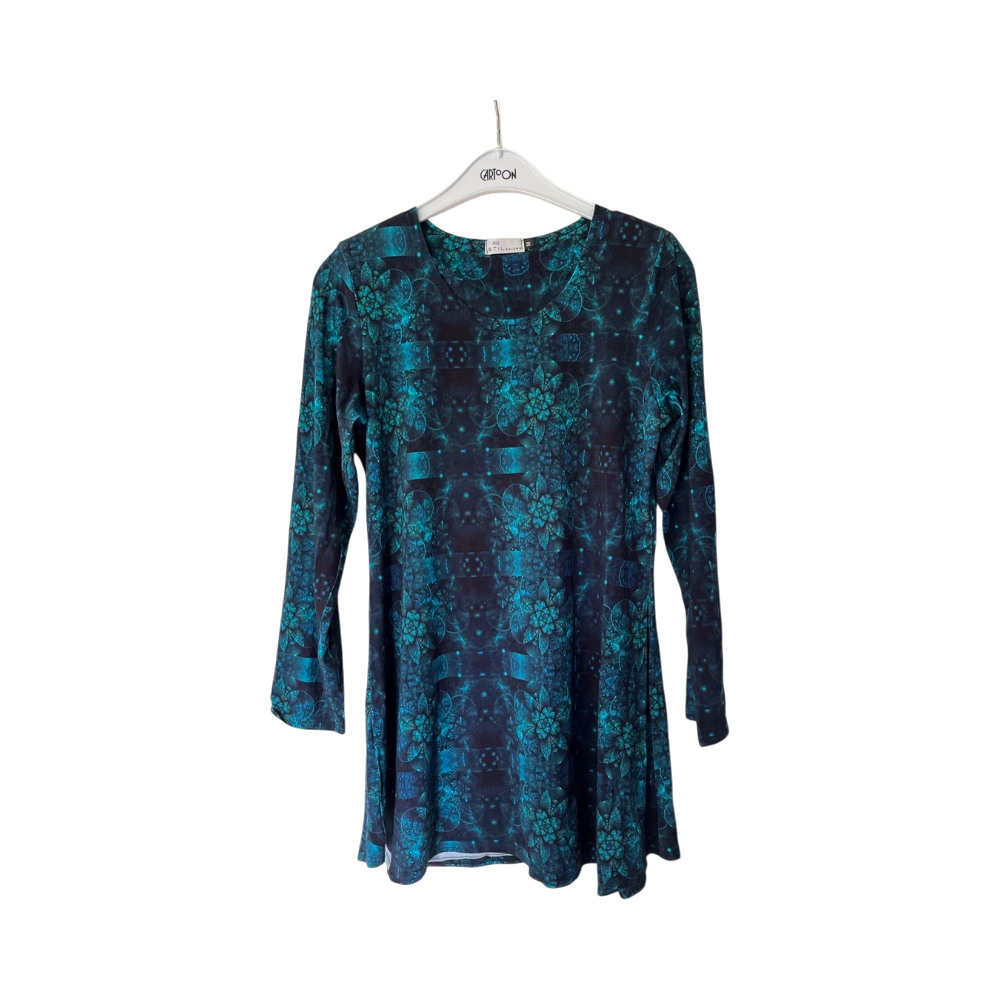 Pitkähihaisen tunika, leveä helma, turkoosi kuviointi.