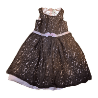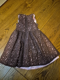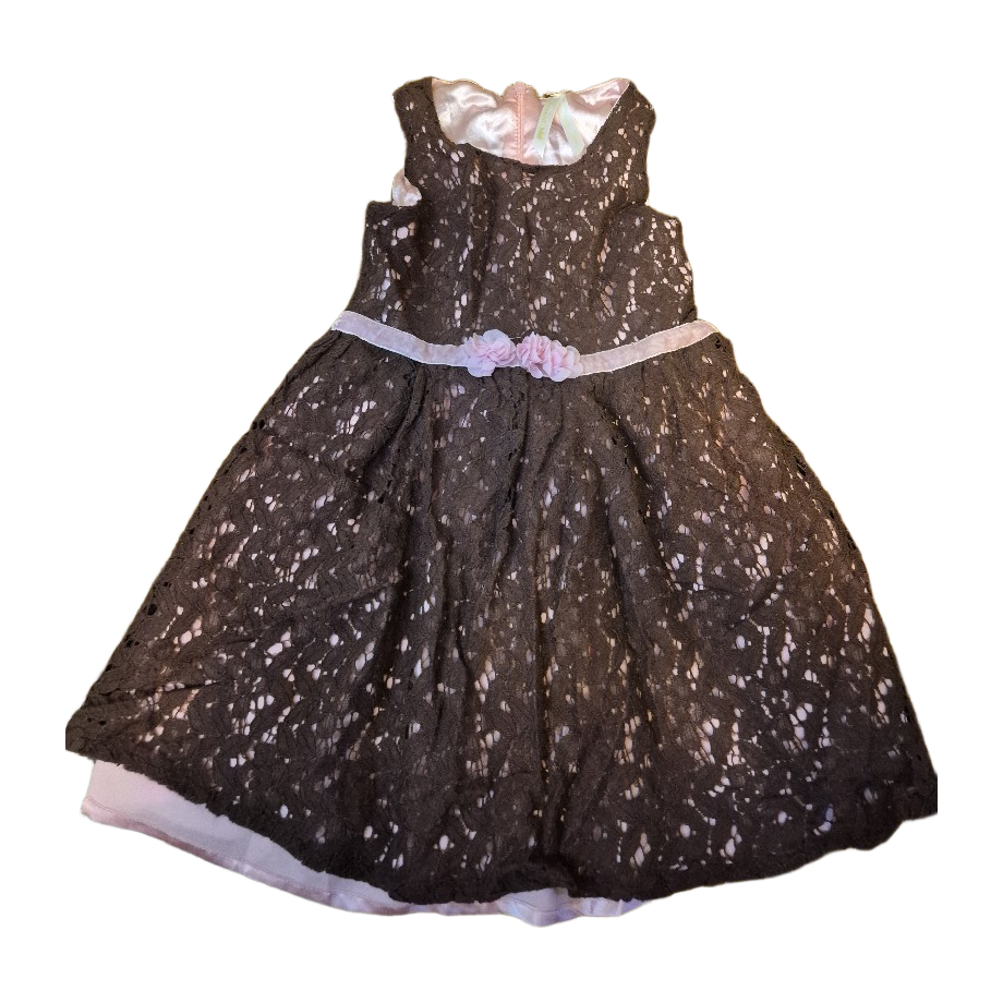 Ruskea pitsimekko vaaleanpunaisilla kukkakoristeilla. Hurmaava juhlamekko etsii uutta pientä juhlijaa <3