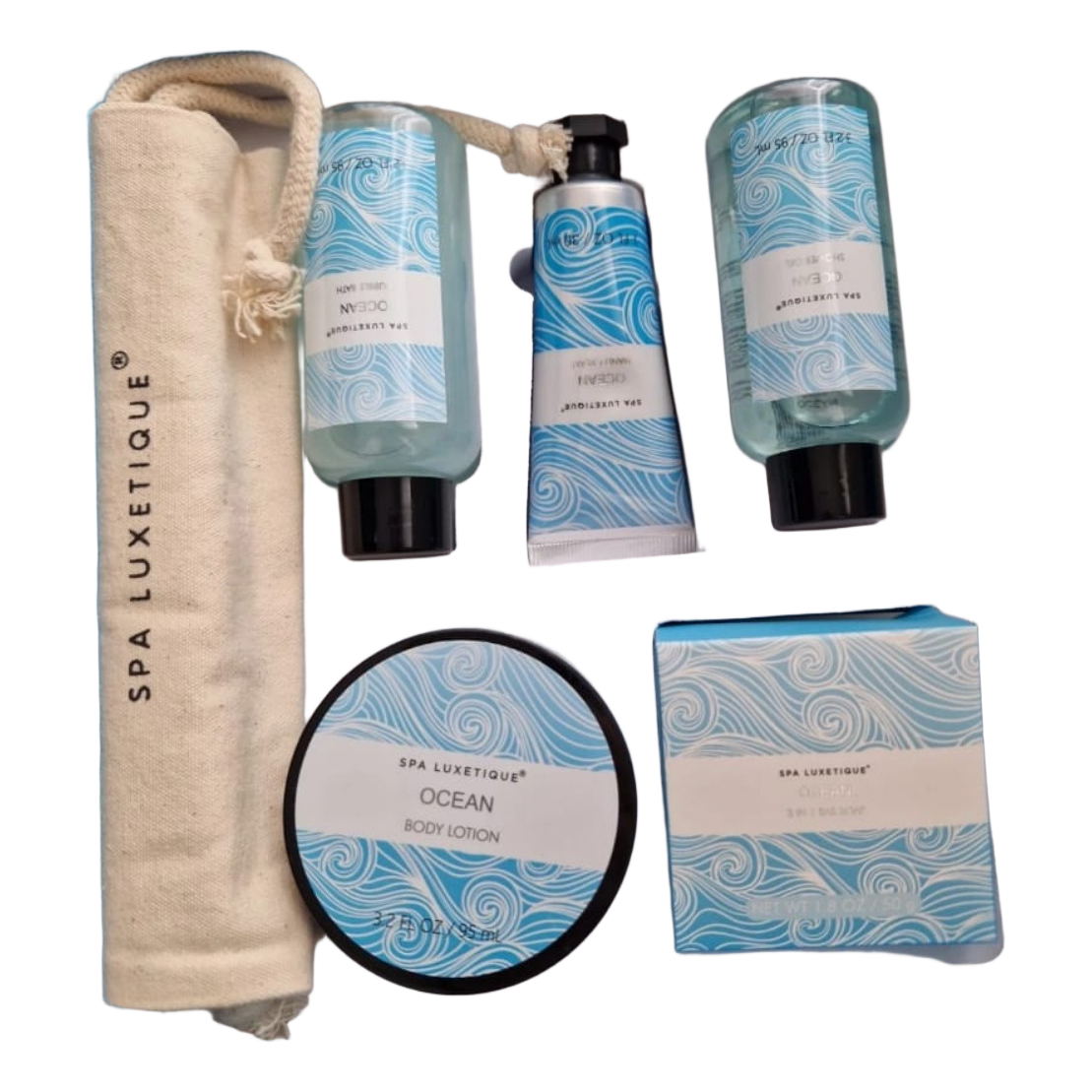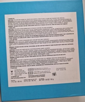 Bath set with shower gel, bubble bath, hand cream, body lotion, and soap bar. Includes a drawstring bag in a presentation box.