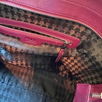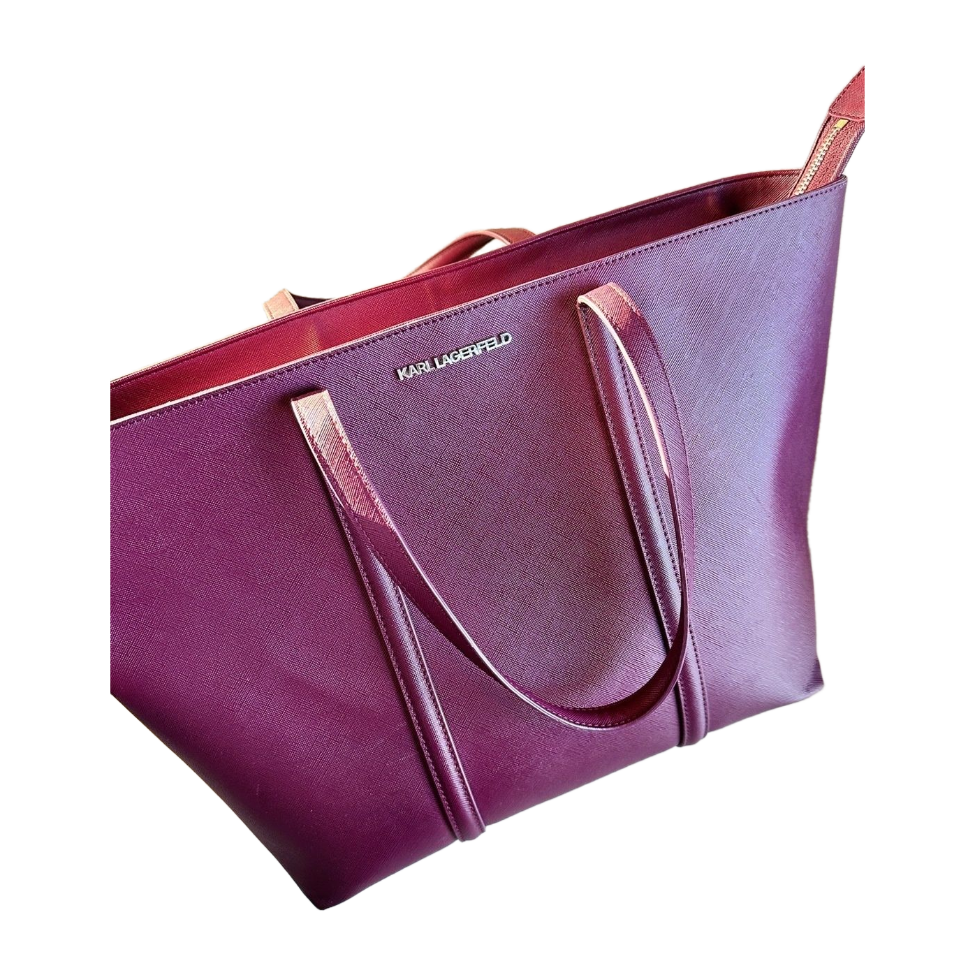 Kaunis viininpunainen iso Karl Lagerfeldin laukku, leveys 45 cm ja korkeus 30 cm. Nätissä kunnossa, ei ole kauheasti pidetty. Muutama hentoinen naarmu nähtävissä materiaalissa, muutoin ei käytön jälkiä. Hopeiset yksityiskohdat.