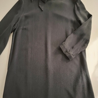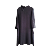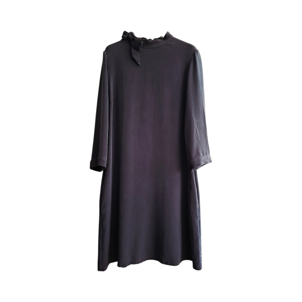 Simple long-sleeve dark navy/black dress with bow neckline, elegant minimal silhouette.