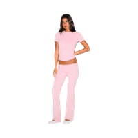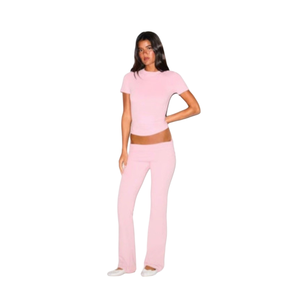 Vaaleanpunaiset foldover-housut, trikookuosi, levät lahkeet.