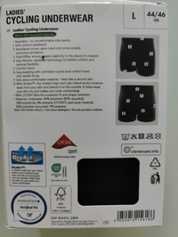 Crivit-merkkiset naisten pyöräilyalushousut istuinpehmusteella. Valmistettu kierrätetystä materiaaleista.